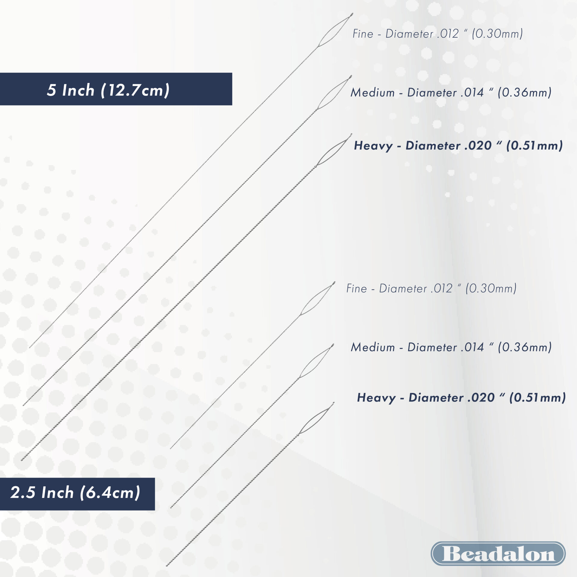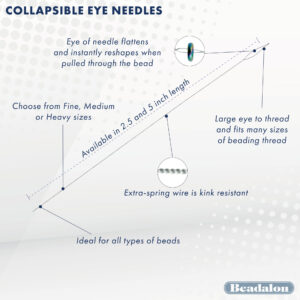 Collapsible Eye Needles are flexible and are particularly nice for stringing beads that have very small holes. Extra-spring wire is kink-resistant and has a specially designed eye that automatically collapses and instantly reshapes when it is pulled through the bead. The large eye is easy to thread and accommodates many sizes of cord.