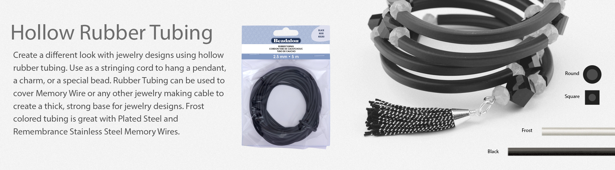 Create a different look with jewelry designs using hollow rubber tubing. Use as a stringing cord to hang a pendant, a charm, or a special bead. Rubber Tubing can be used to cover Memory Wire or any other jewelry making cable to create a thick, strong base for jewelry designs. Frost colored tubing is great with Plated Steel and Remembrance Stainless Steel Memory Wires.
