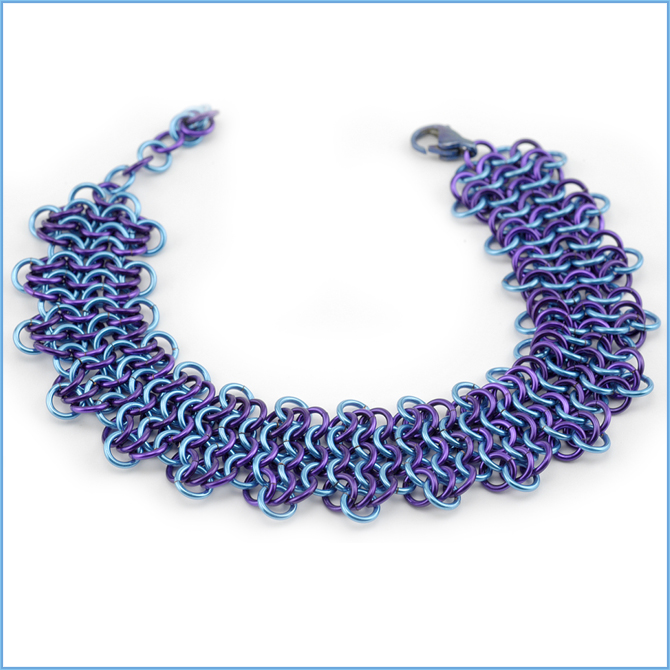 CABBAGE PATCH BRACELET By: Lauren AndersenMaterials:20 gauge Orchid (S07) Artistic Wire® cut into 150 1/8″ (3.18mm) ID jump rings (A) 20 gauge Peacock Blue (S01) Artistic Wire® cut into 135 1/8″ (3.18mm) jump rings(B) Gunmetal Lobster Claw Clasp 2 pair of either Chain Nose Pliers Flat Nose Pliers Bent Nose Pliers or any combination of pliersSteps:Step 1: Take one open (A) jump ring and scoop up your clasp and two closed (B) jump rings. Step 2: Grasp the clasp and the (A) jump ring using the side of your index finger and your thumb of your non-dominant hand, flip the two (B) jump rings up to make what looks like mouse ears. Make sure the mouse’s forehead, the (A) jump ring, is in front. Step 3: Take one open (A) jump ring and enter the mouse’s right ear, (B) jump ring added in step 1, from the front and go around his head in the back and come back up through his left ear, the other (B) jump ring added in step 1, from the back. Before closing the (A) ring, add two closed (B) rings. Step 4: Make “mouse ears” from the four closed (B) rings, the two from step 1 and the two from step 3. Step 5: Take one open (A) jump ring and scoop up the two (B) jump rings you added in step 3, using the same method of entering the mouse’s right ear, (B) jump ring, from the front and go around the mouse’s head in the back and come back up though his left ear, the other (B) jump ring, from the back. Before closing the (A) ring, add two closed (B) rings. Step 6: Repeat the process: a) Make “mouse ears” b) With one open (A) ring, scoop up the two most recently added closed (B) jump rings c) Add two closed (B) jump rings.